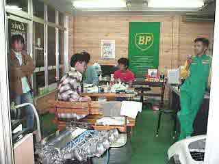 手前のエンジンがインチキ001号の心臓部。店内は木目調の落ち着いた雰囲気です